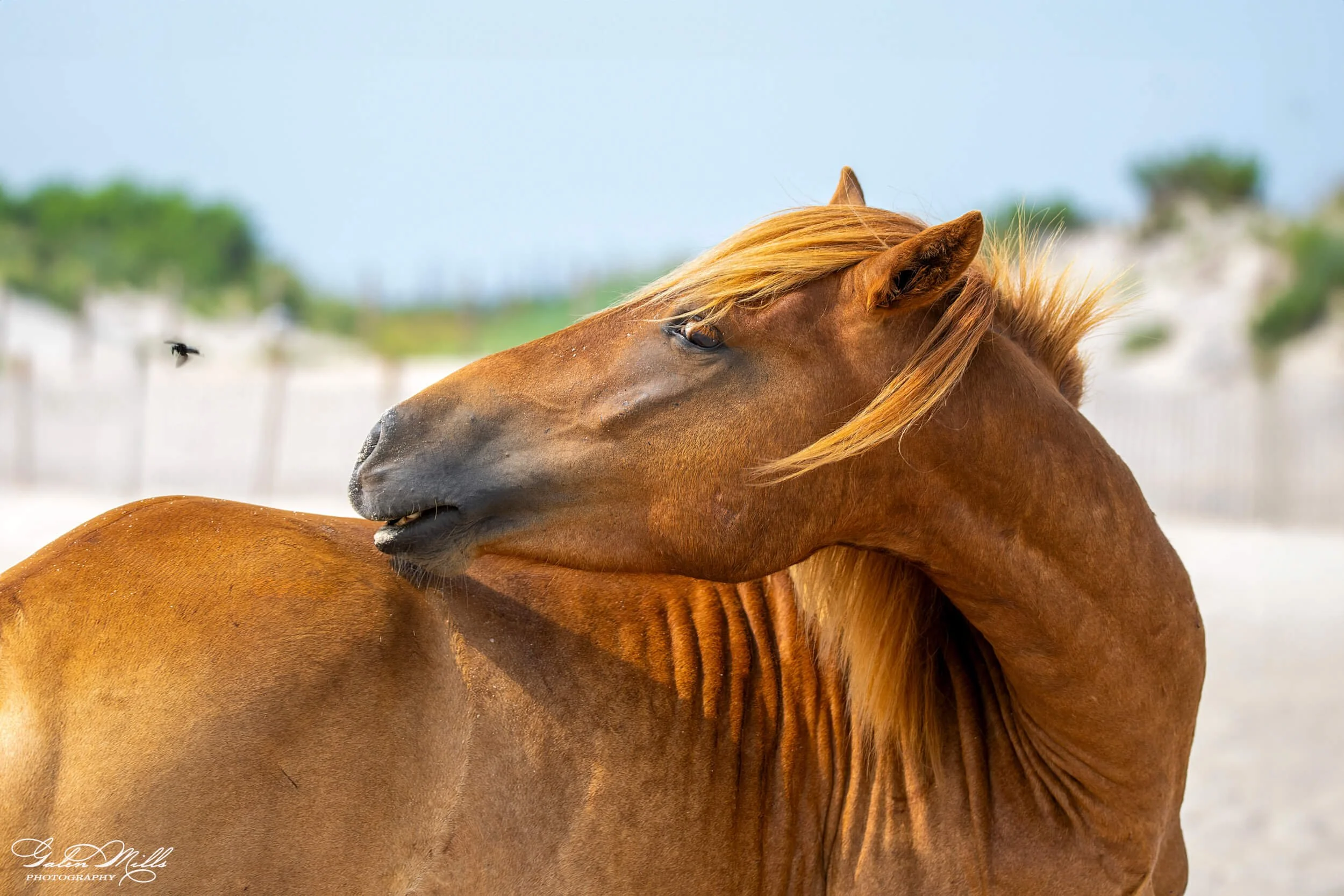 As I was setting up my camera near the beach at the Assateague State Park, I couldn't help but overhear a hilarious conversation between an Assateague Horse and a horse fly buzzing around its head. The horse, with a nonchalant flick of its tail, said, "You know, I could use a personal fly-swatter. Interested in the job?" The horse fly, undeterred, replied, "No thanks, I prefer the thrill of the chase!"